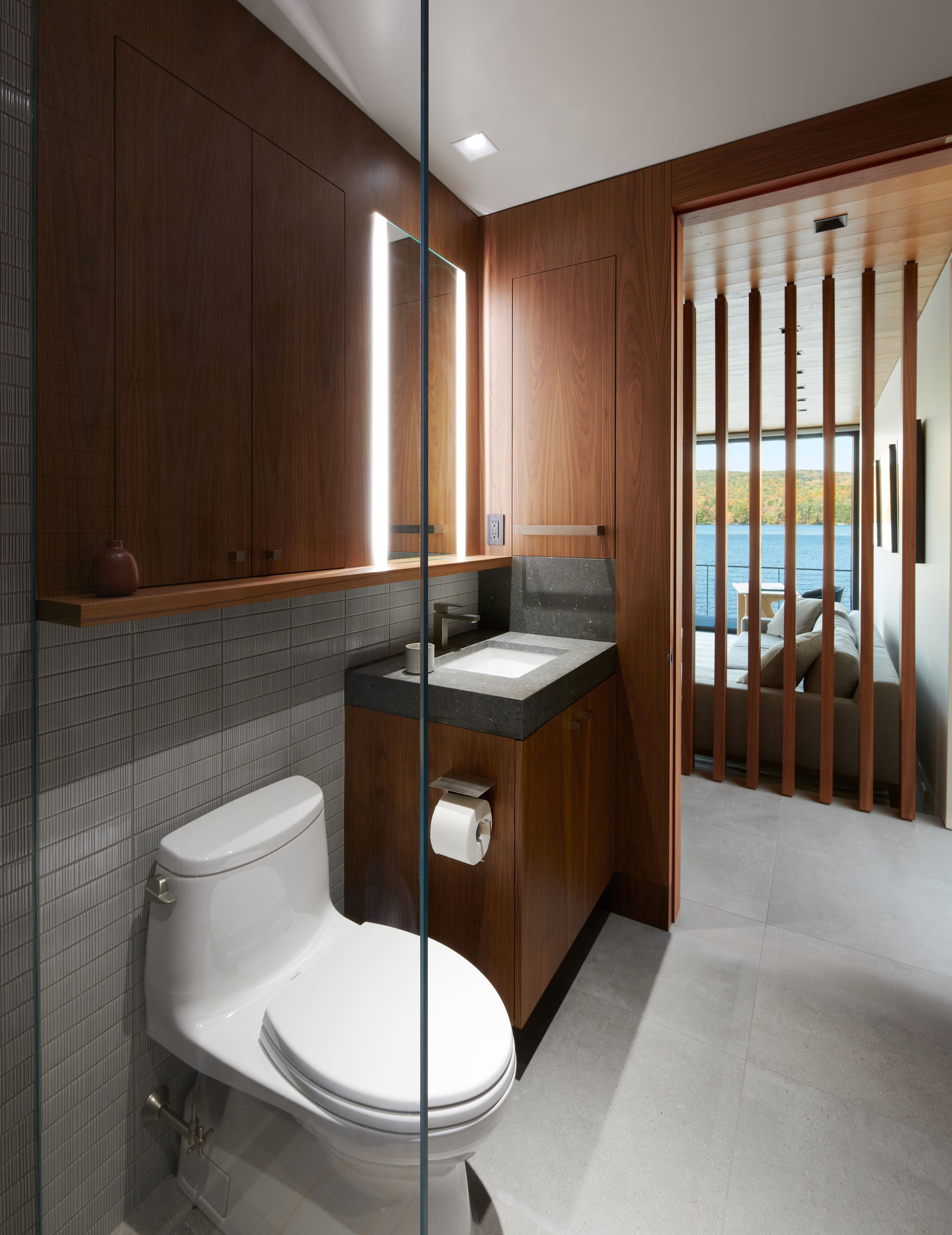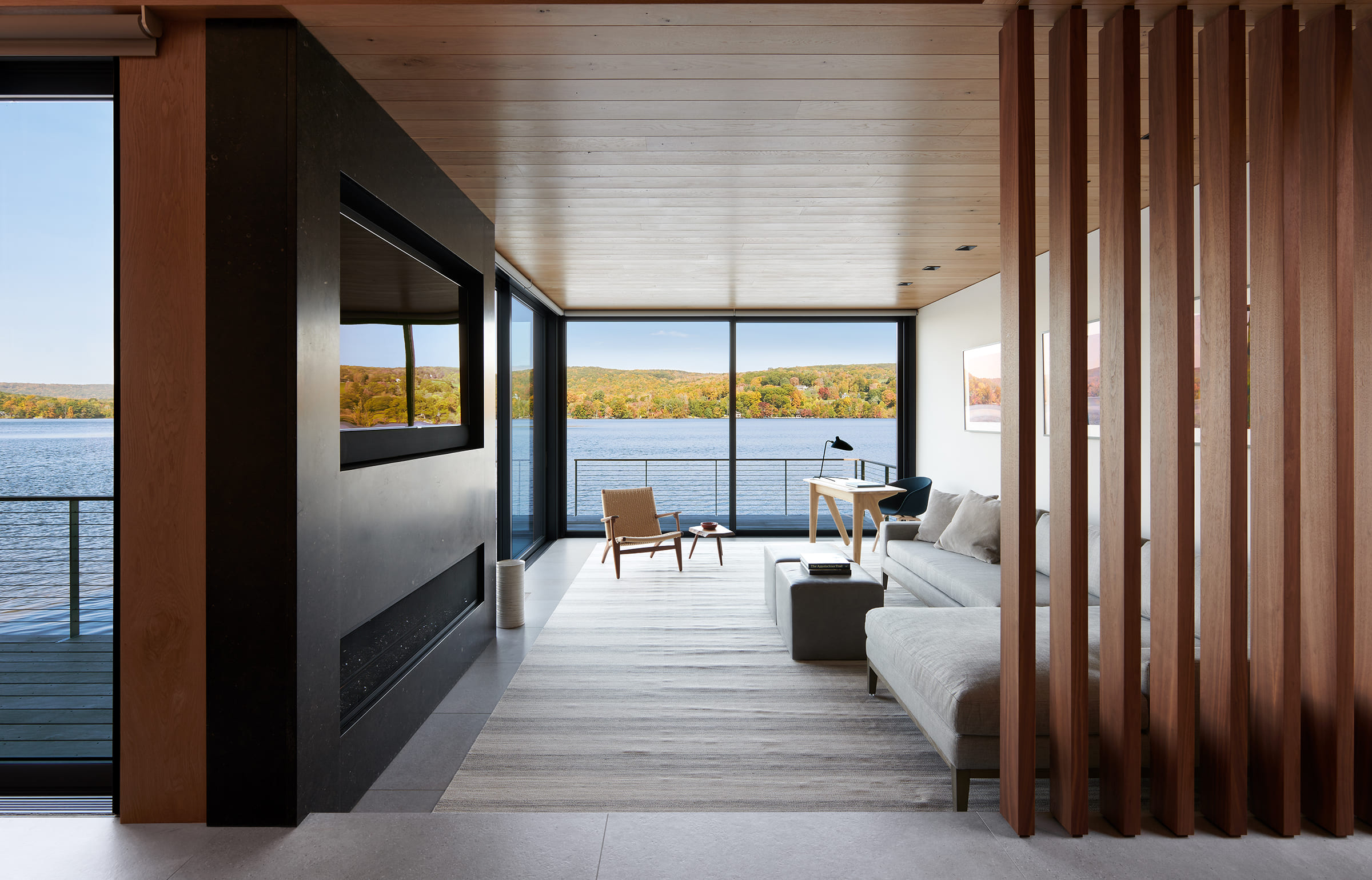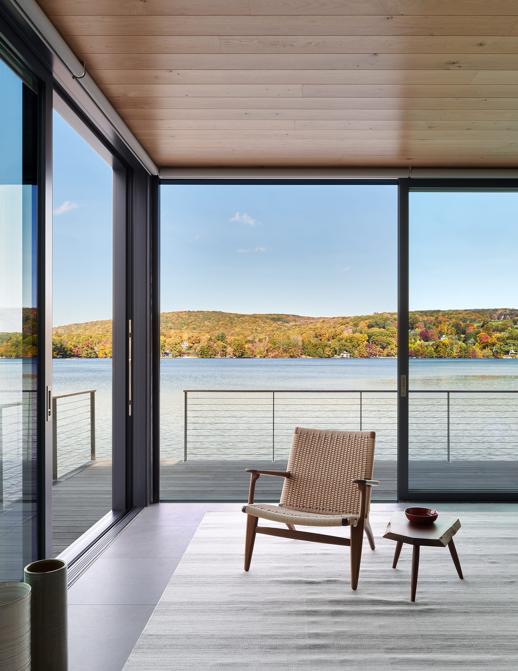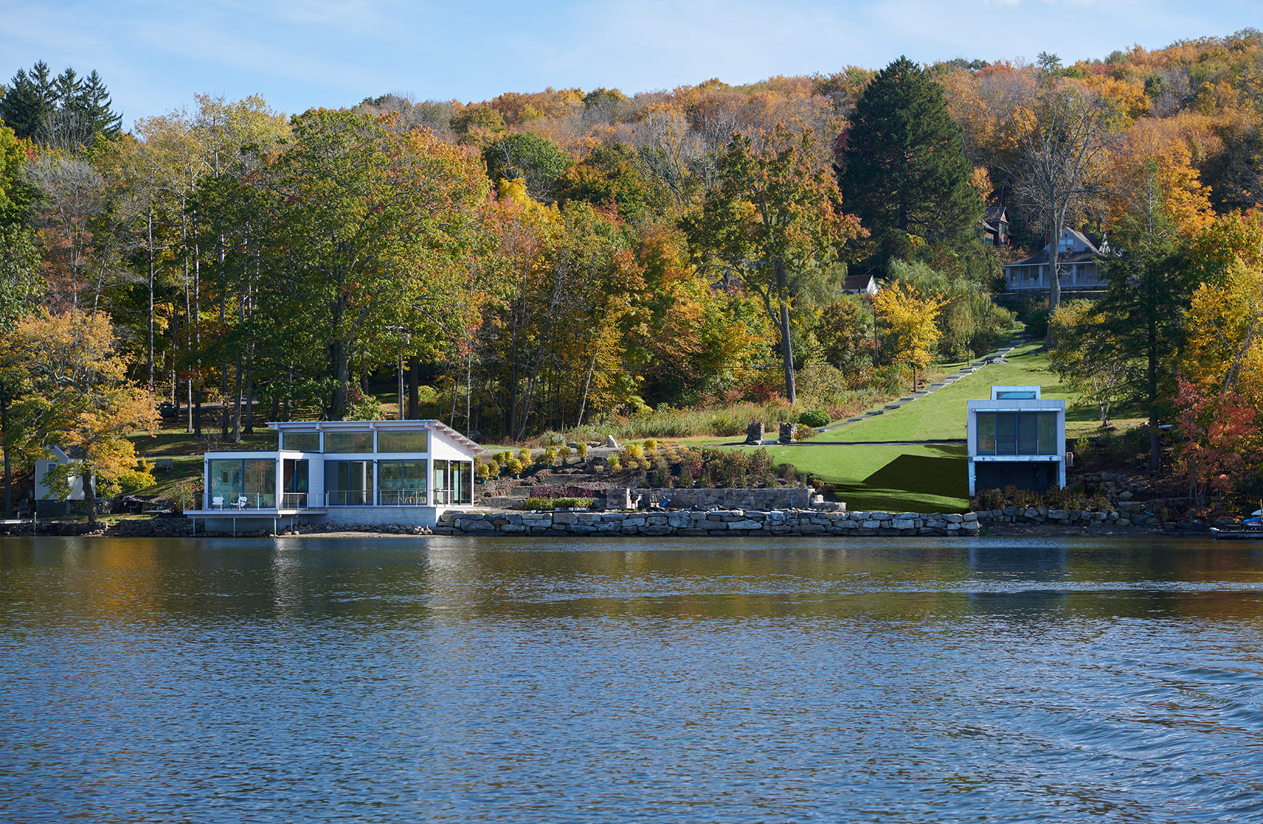 This lakeside pavilion is the first phase of an estate plan in the town of Washington, CT. The pavilion replaces an obsolete 19th century boathouse with a new structure designed for lakeside dining and entertainment. The structure is discretely nestled into a hillside, allowing for privacy from the adjacent road. Facing the water, the structure is composed of steel, timber and glass and is designed for maximum exposure to daylight and lake views.