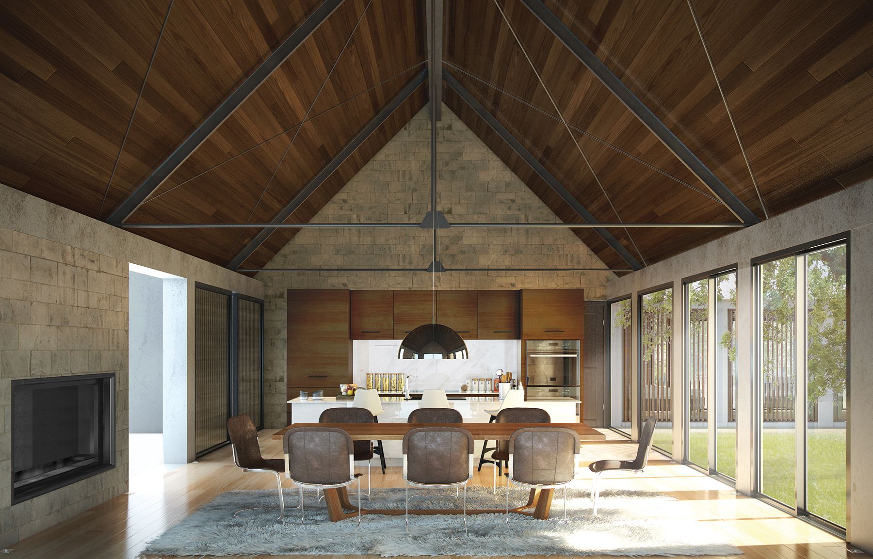 This 5,000-square-foot residence lies at the end of a long, winding drive in the Hudson Valley town of Red Hook, NY, at the edge of a meadow and surrounded by woodlands. Conceived as an intimate private residence, able to both accommodate family gatherings and entertain guests, the house is organized along a series of interconnected perpendicular axes that create sightlines to carry the eye through the interior and out into the landscape beyond. These axes also divide the home into several pavilions, each with a separate function: There’s a grand entertaining pavilion, master and guest-suite pavilions, a library pavilion that converts into a second guest suite and a garage with a loft-like second-floor space that can be used as an additional guest apartment.