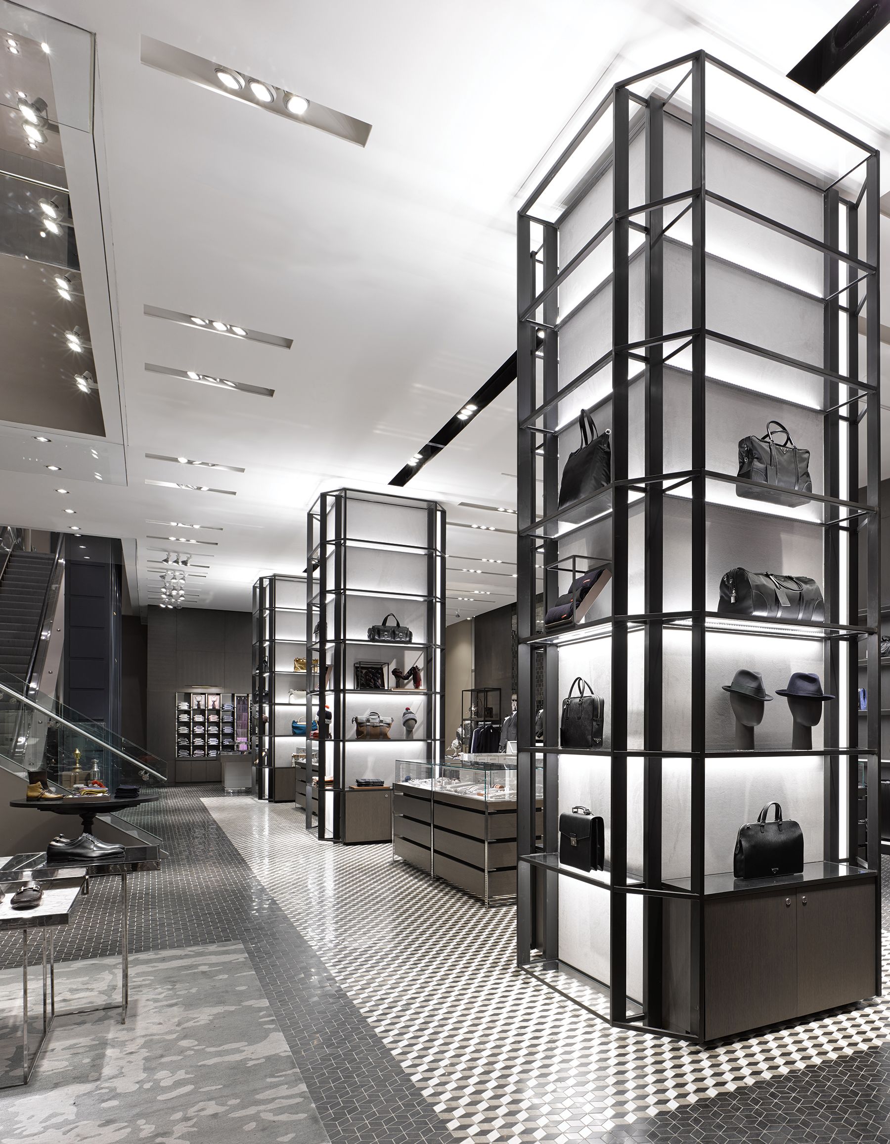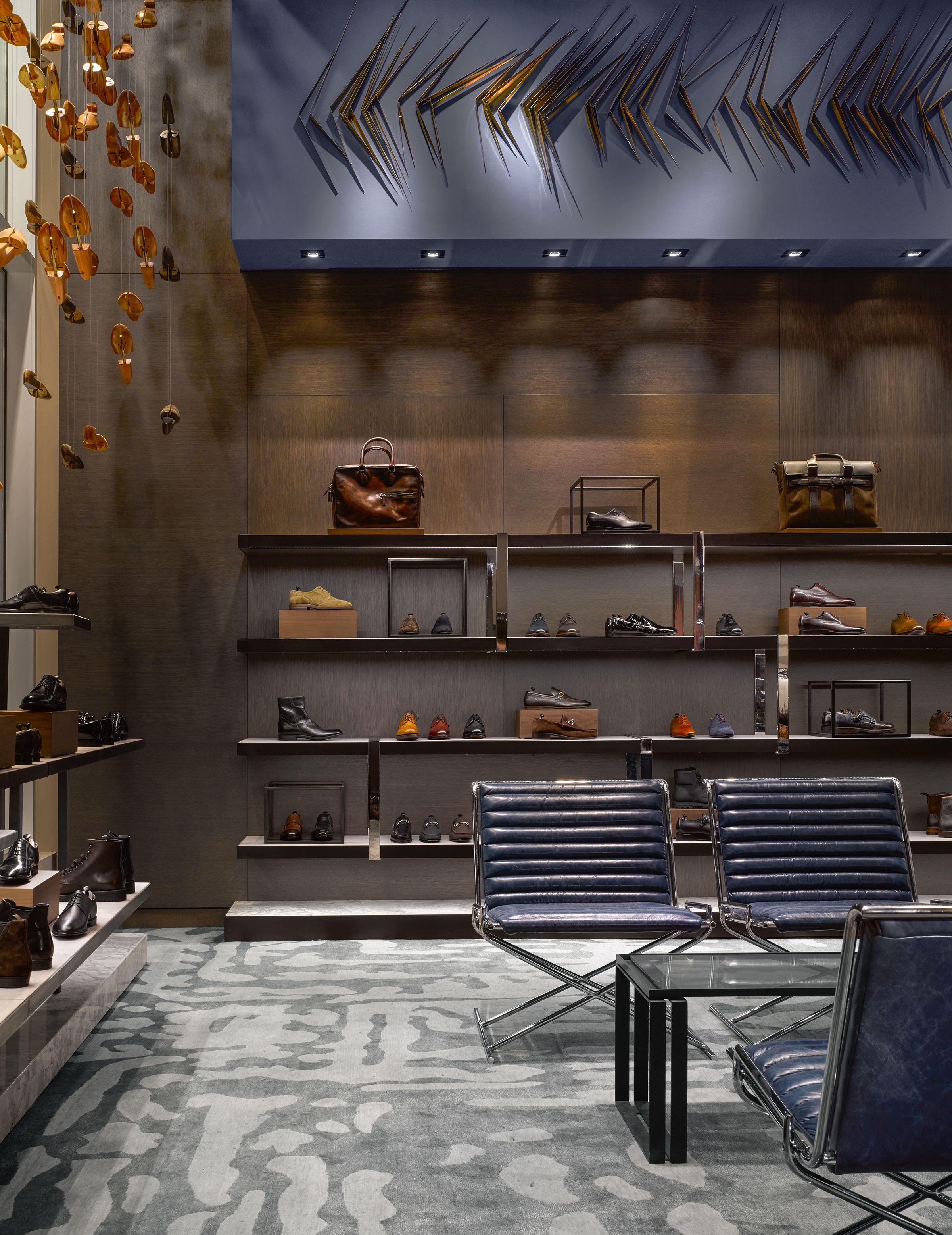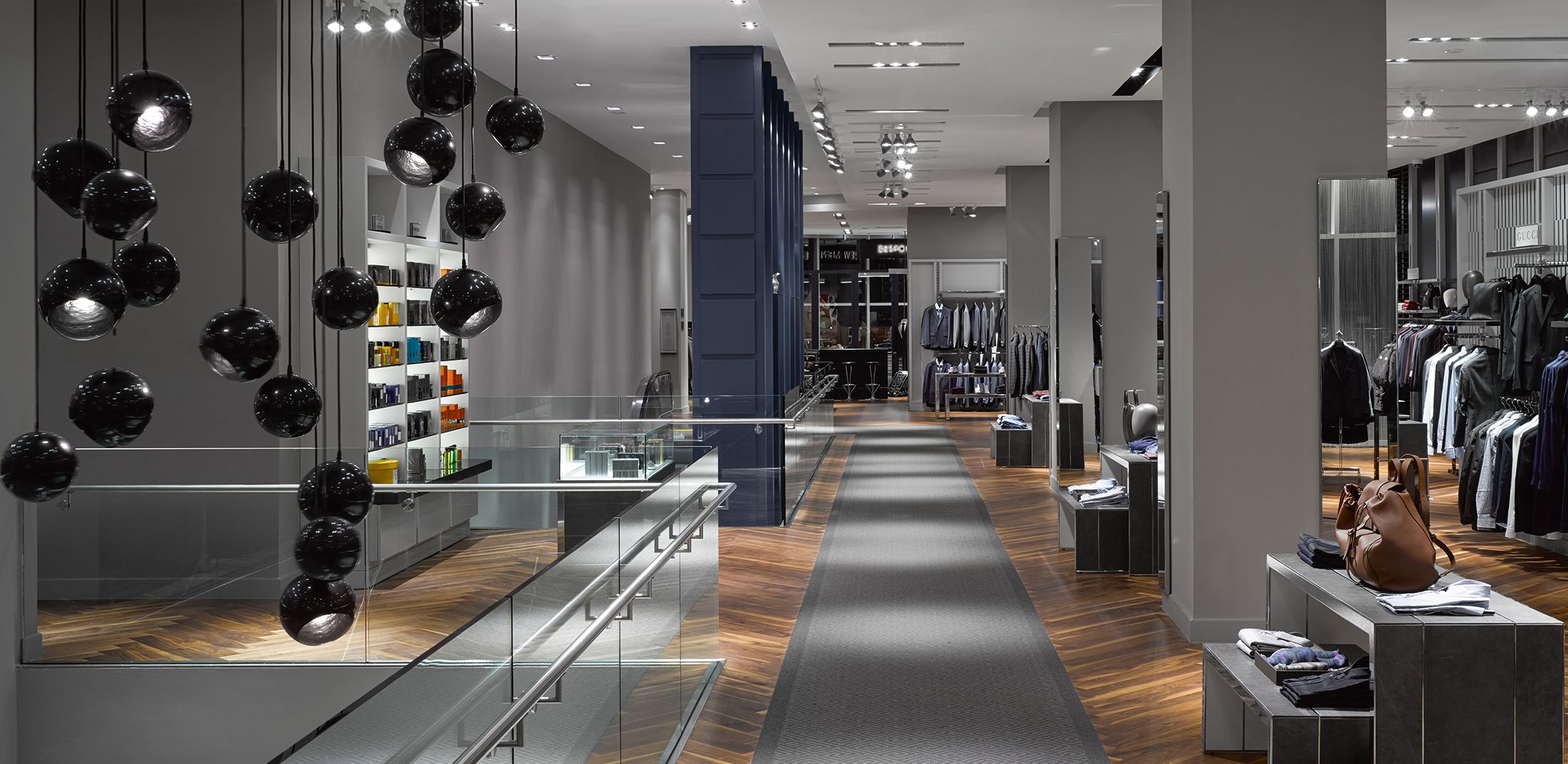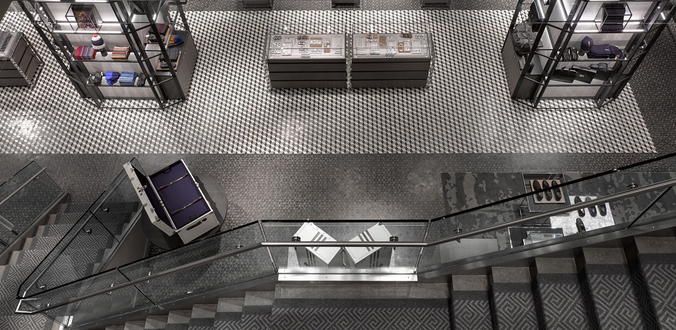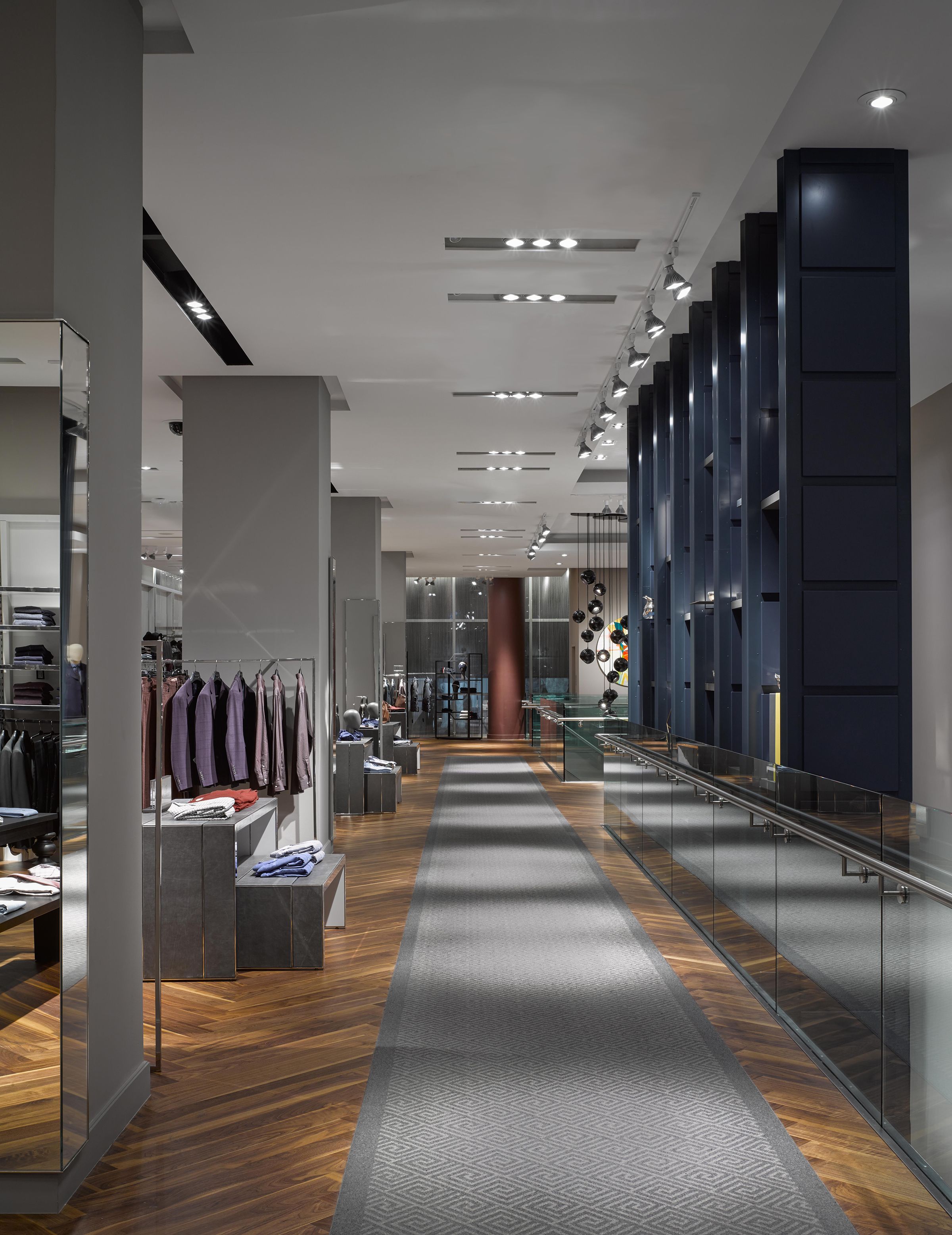Holt Renfrew’s debut stand-alone men’s concept, this 16,000-square-foot space on Toronto’s fashionable Bloor Street represents a departure for the Canadian luxury retailer, its masculine design resembling a private club as much as a store. On the main level, internally lit shelving in gray-stained white oak and blackened stainless steel surrounds central columns. A custom mosaic-tile floor connects leather goods, jewelry and men’s furnishings, while a hand-knotted custom carpet and deep-blue leather-upholstered polished stainless-steel chairs define the footwear area. On the fashion-focused second level — which includes a personal-shopping suite and bespoke-tailoring shop —walnut shutters and herringbone flooring create a residential feel, and a patterned-wool runner marks a circulation path. A double-height structural screen extends through the escalator atrium, creating a strong visual connection between the two floors and providing additional visual merchandising space.