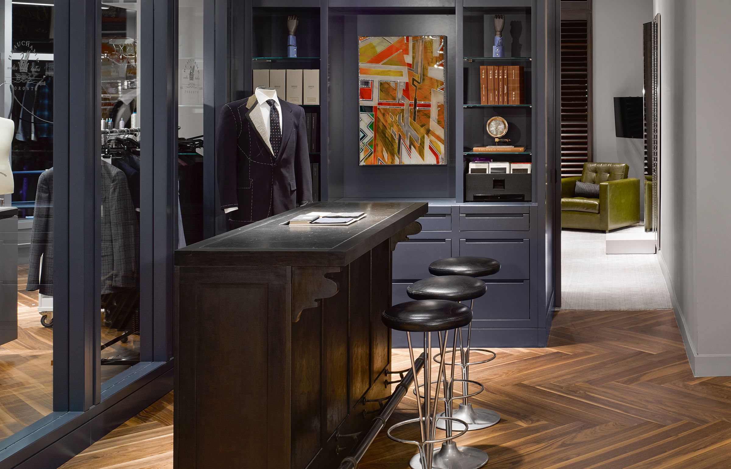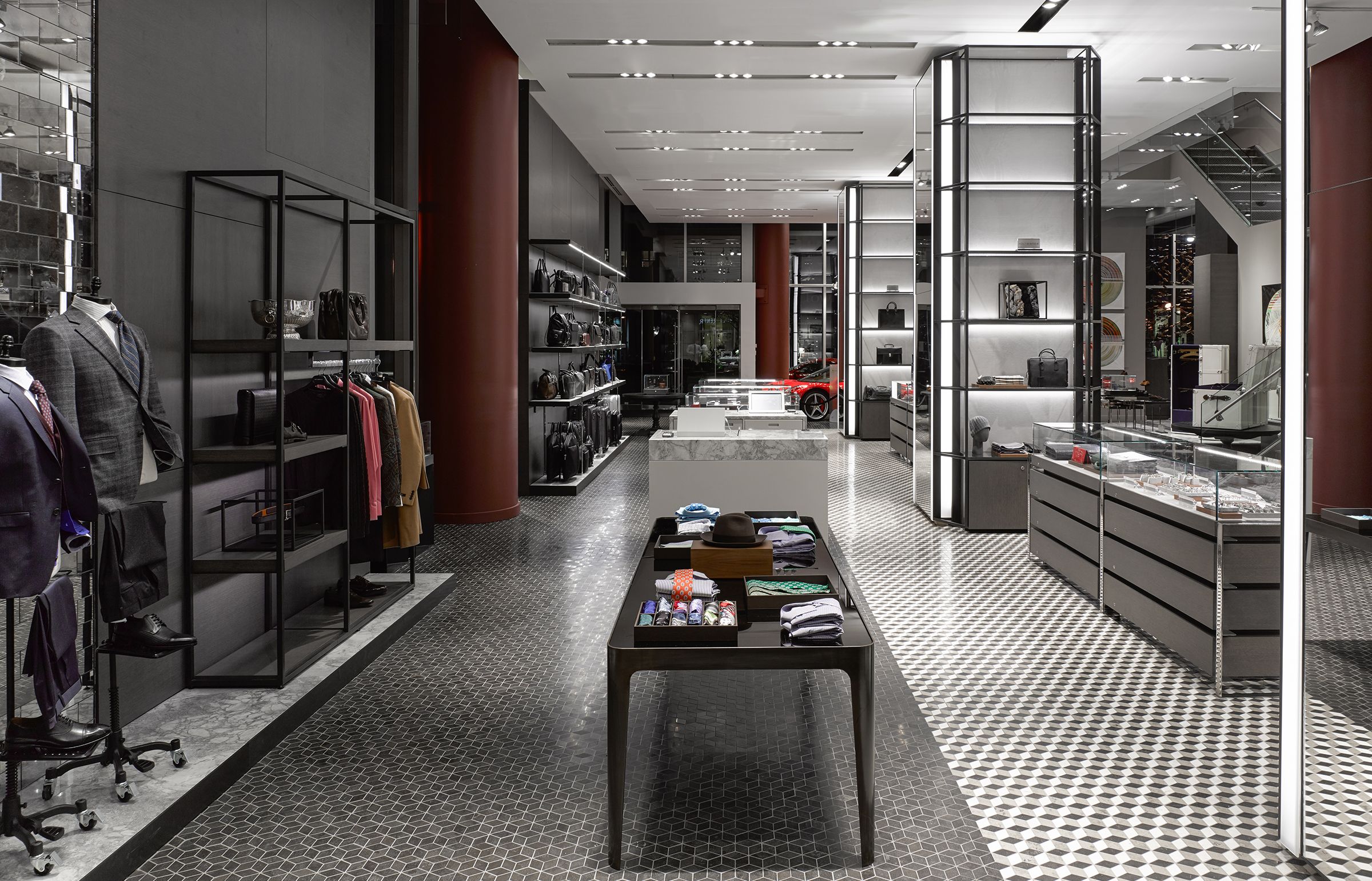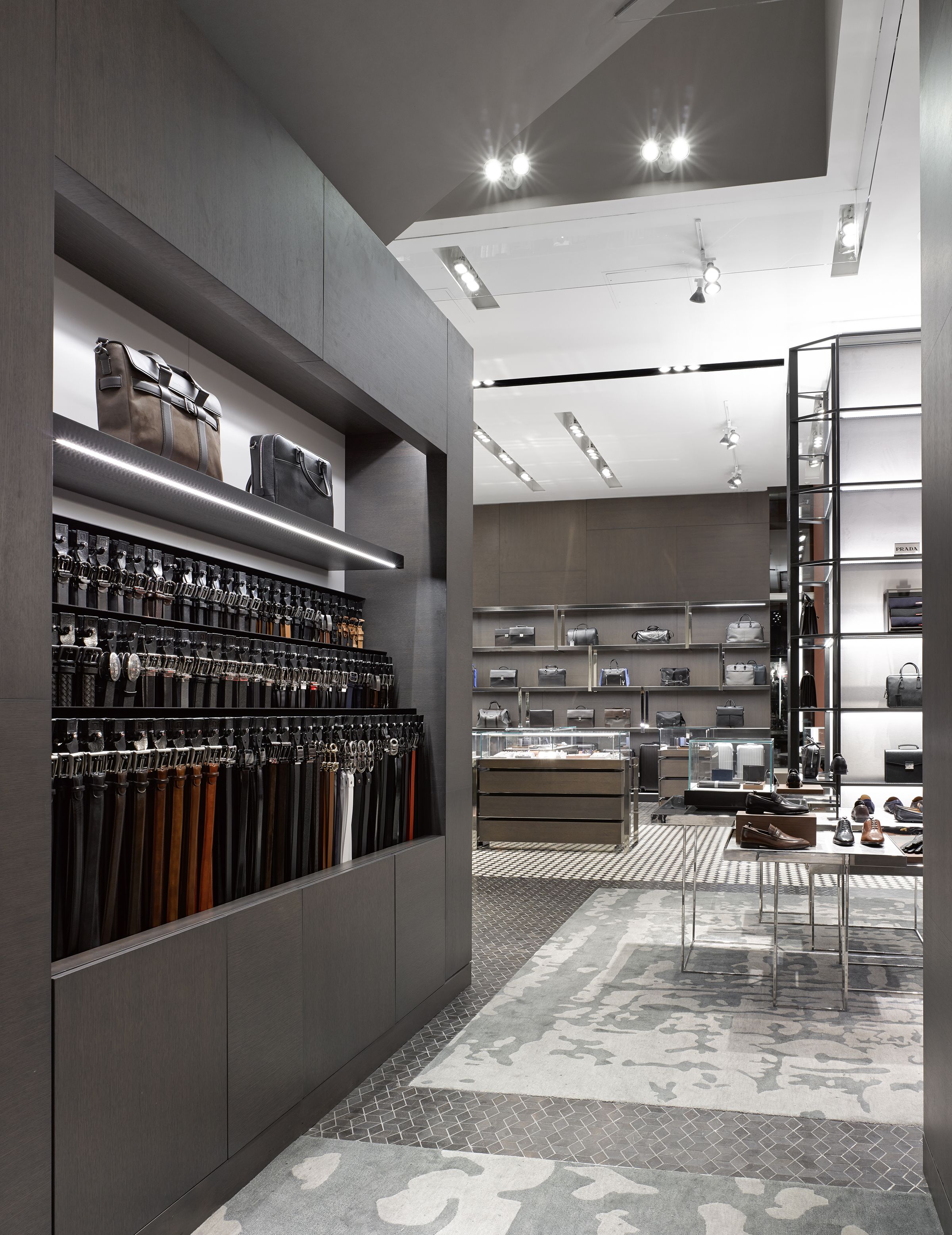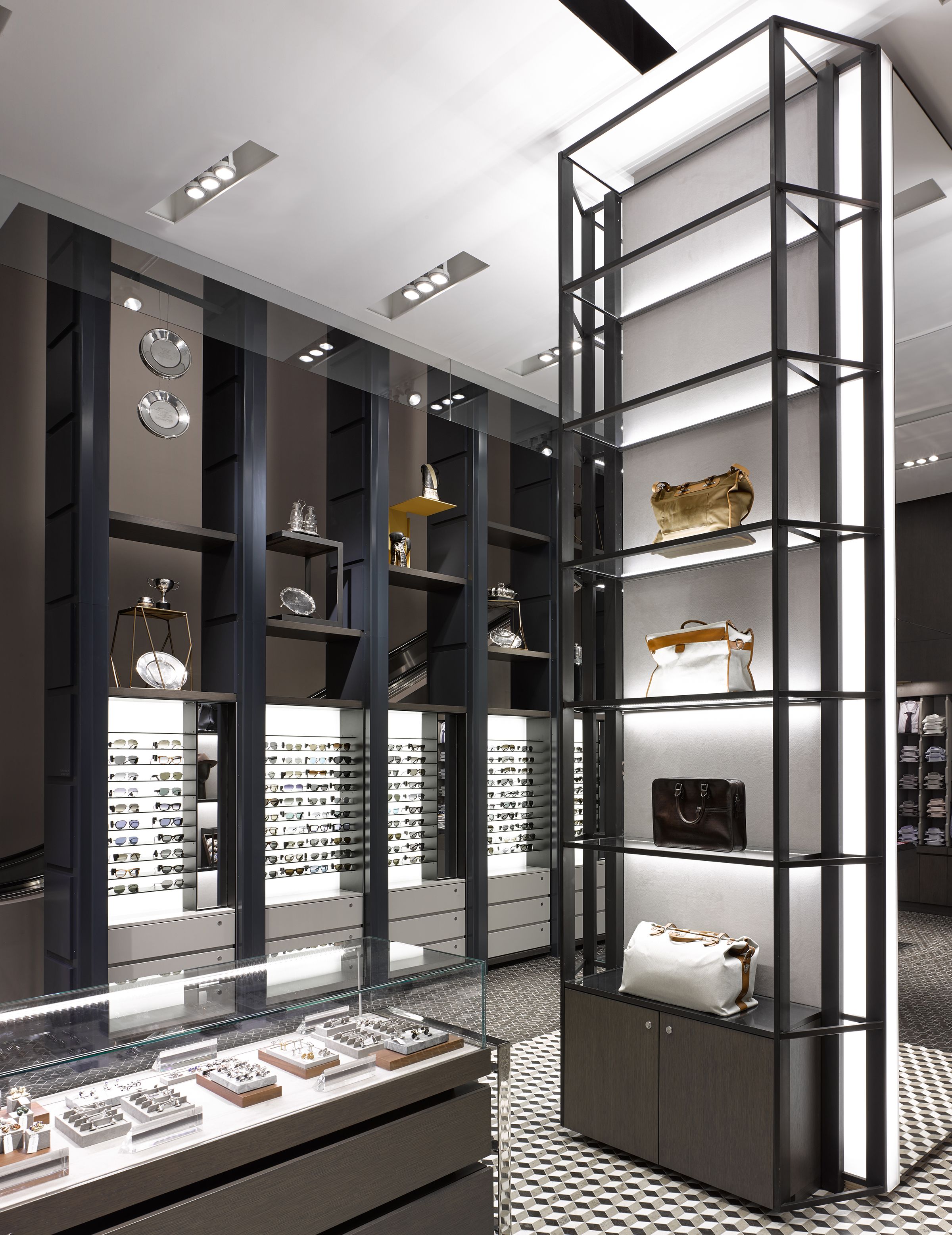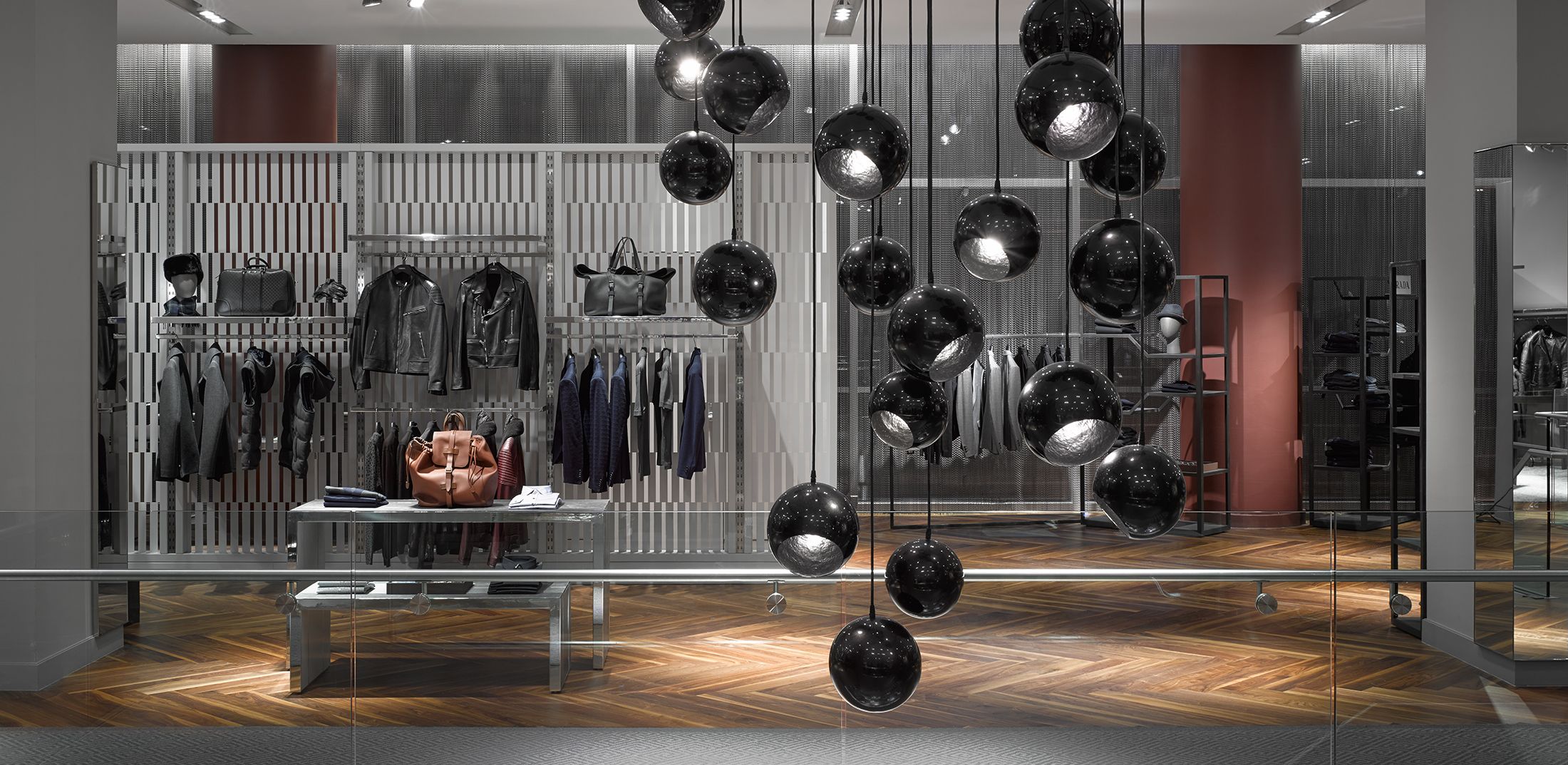 Holt Renfrew’s debut stand-alone men’s concept, this 16,000-square-foot space on Toronto’s fashionable Bloor Street represents a departure for the Canadian luxury retailer, its masculine design resembling a private club as much as a store. On the main level, internally lit shelving in gray-stained white oak and blackened stainless steel surrounds central columns. A custom mosaic-tile floor connects leather goods, jewelry and men’s furnishings, while a hand-knotted custom carpet and deep-blue leather-upholstered polished stainless-steel chairs define the footwear area. On the fashion-focused second level — which includes a personal-shopping suite and bespoke-tailoring shop —walnut shutters and herringbone flooring create a residential feel, and a patterned-wool runner marks a circulation path. A double-height structural screen extends through the escalator atrium, creating a strong visual connection between the two floors and providing additional visual merchandising space.