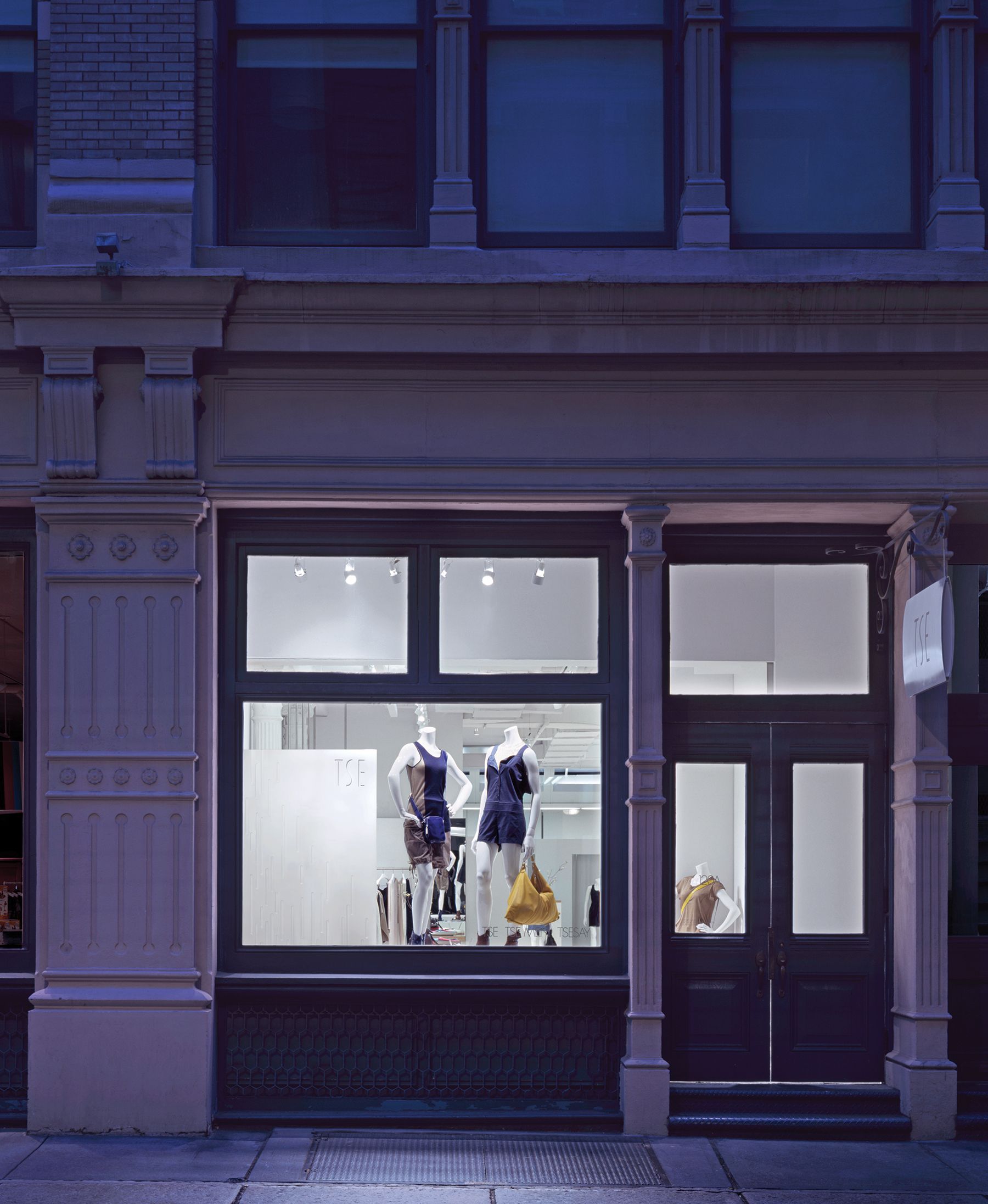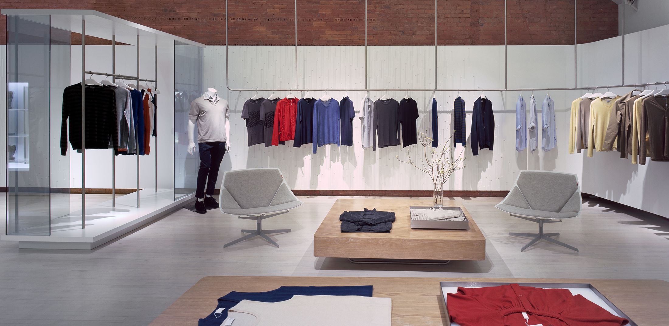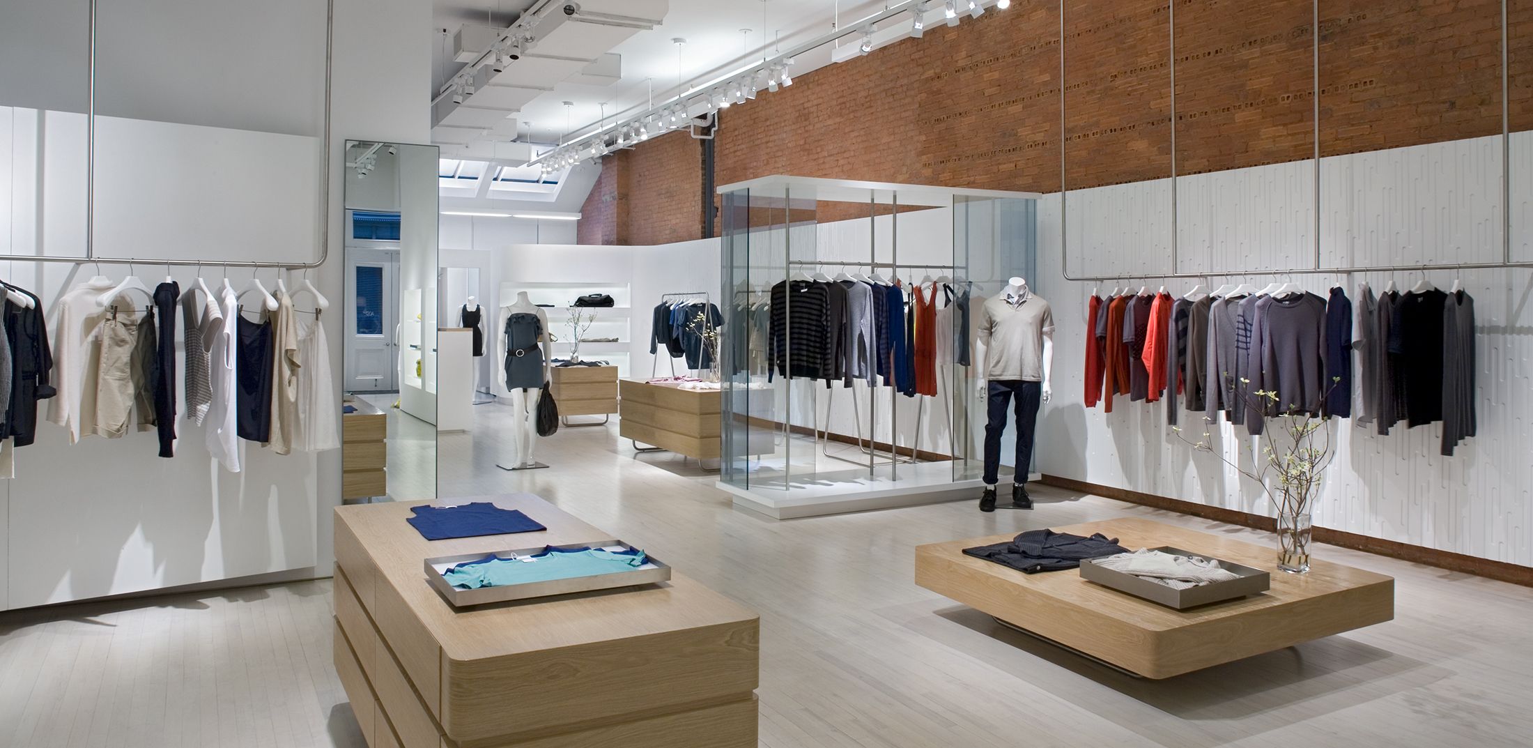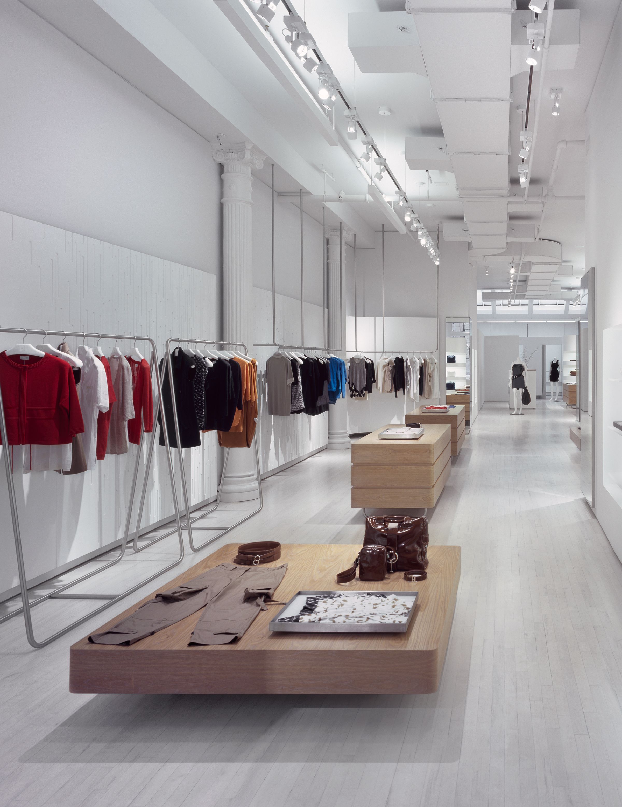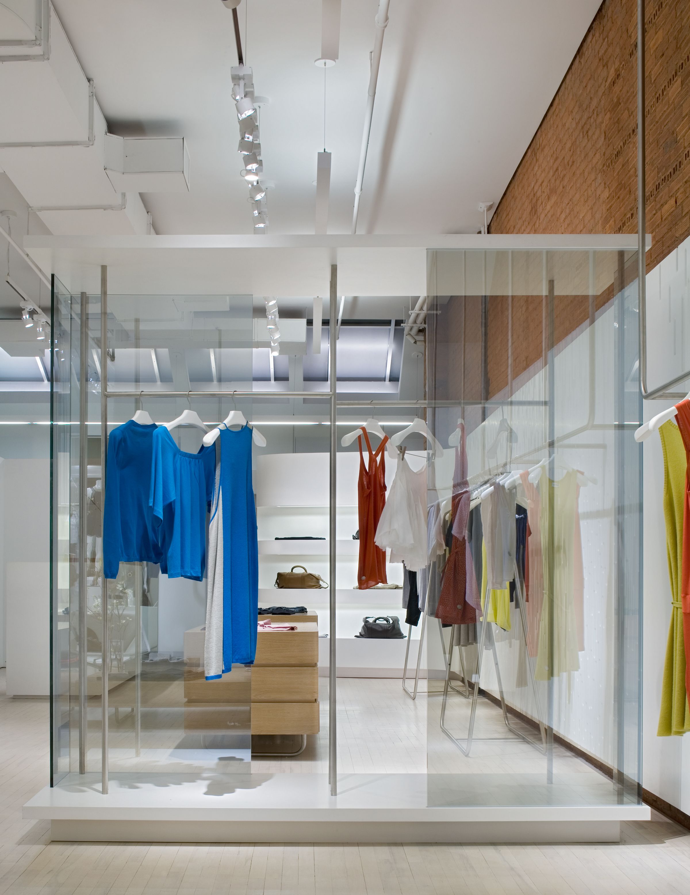 The design for this downtown Manhattan outlet of the high-fashion cashmere label TSE was born out of the aesthetic of a historic, quintessentially gritty Soho loft, now newly outfitted with modern, luxurious finishes. The boutique retains the brick walls, oak floors and exposed ductwork and piping of the original raw space, juxtaposing them with refined, highly lacquered, soft-white wall panels whose curving shape creates a ribbon effect throughout the store. The smooth finishes of these panels both contrast with and complement the rich, intricate textures of the cashmere. Lightweight display fixtures — made of gently arched, satin-finished stainless-steel bars — hang from the ceiling or stand in front of walls, giving the sense that the clothing is floating above the floor or in front of the lacquered panels, rather than simply hanging.