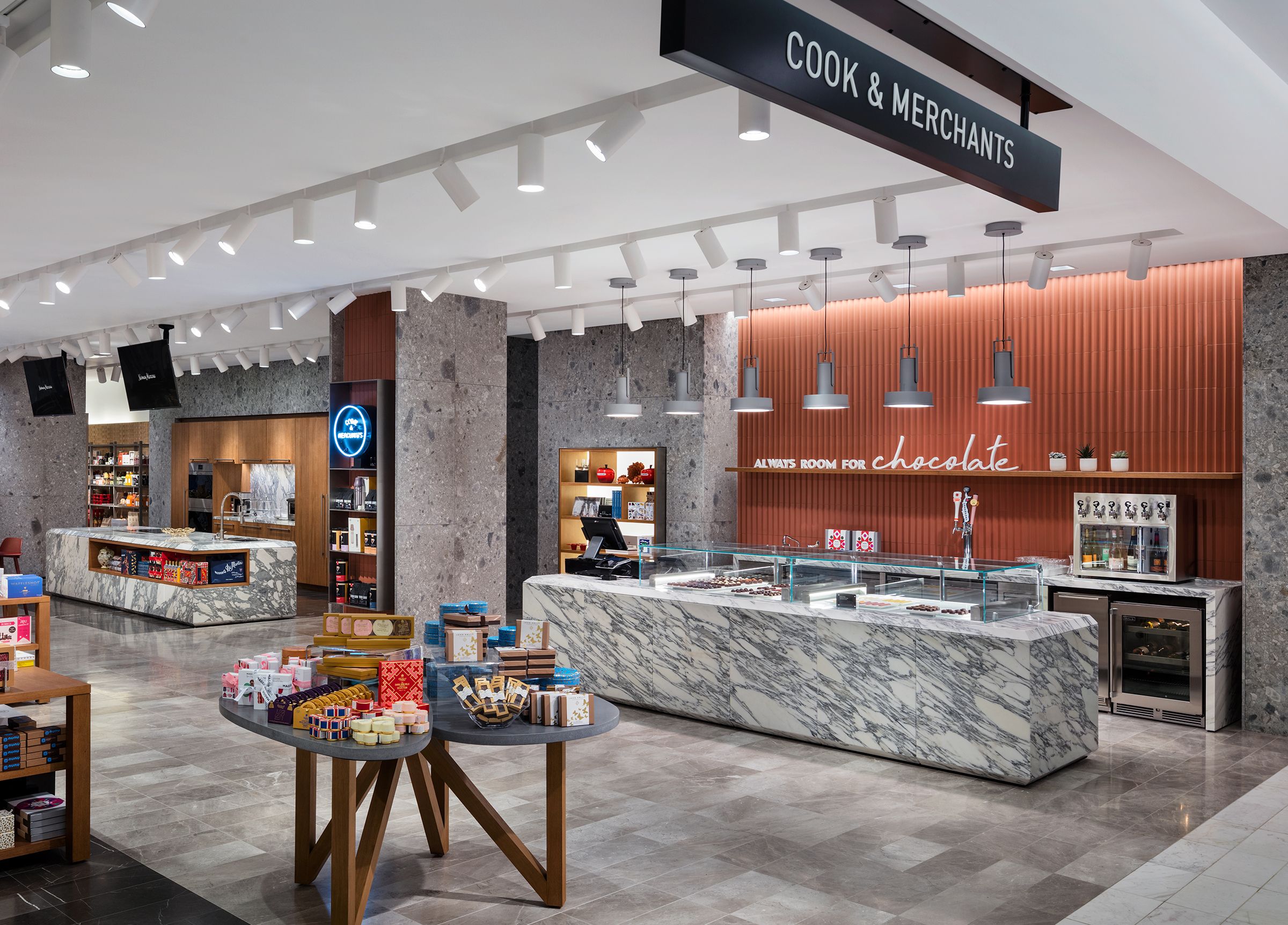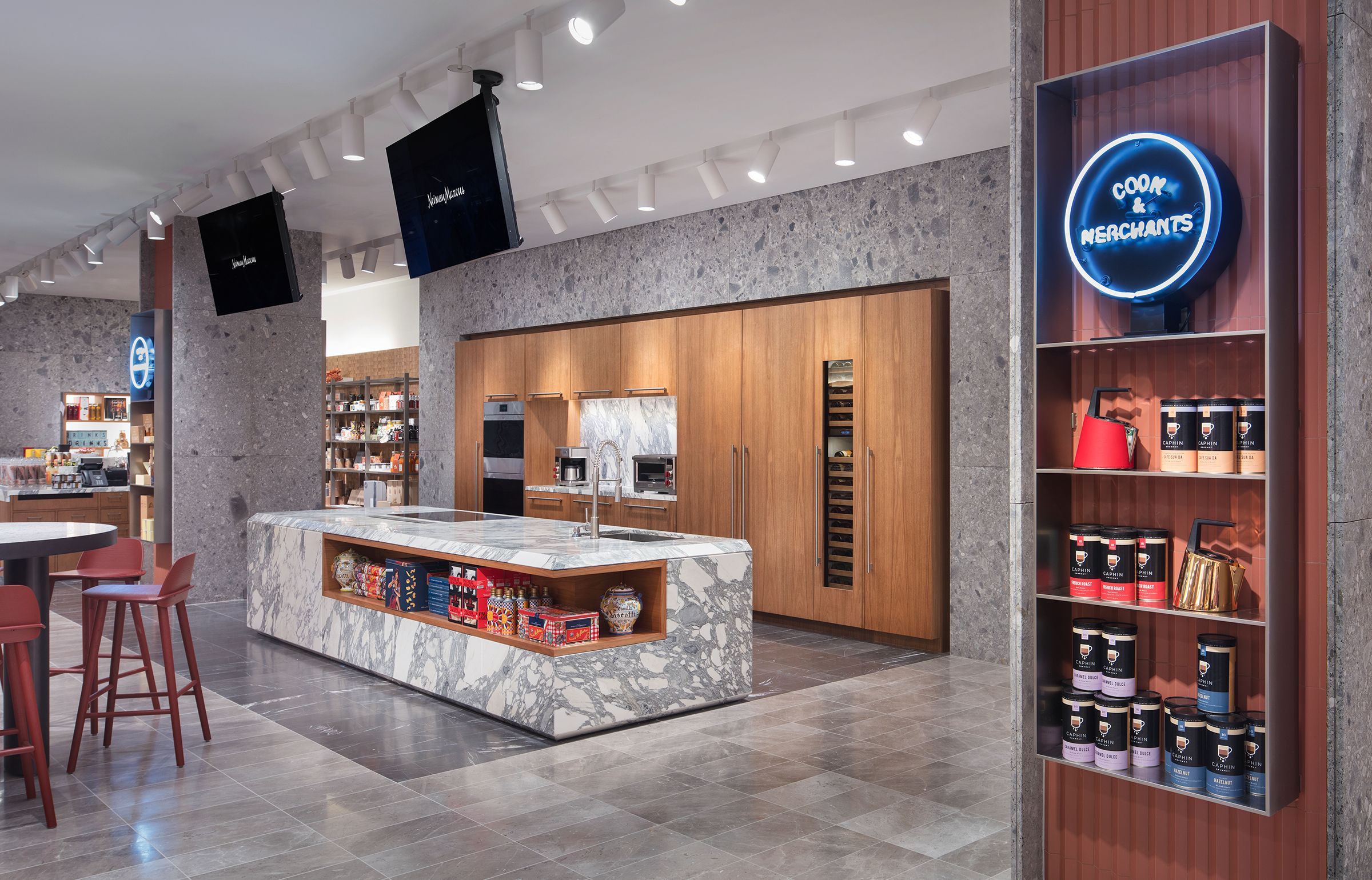 Cook & Merchants is a new Food Hall concept created by janson scuro for Neiman Marcus. The 3000 square foot space at the Hudson Yards New York City flagship includes a gourmet coffee bar, a chocolate, beer and wine bar, a spacious demonstration kitchen, and seating and retail areas.