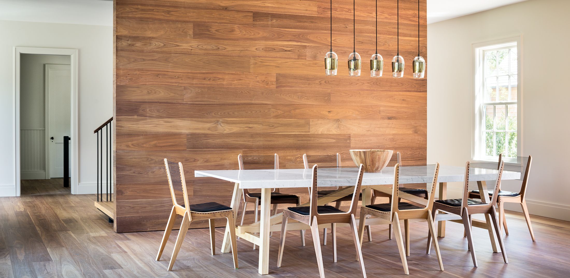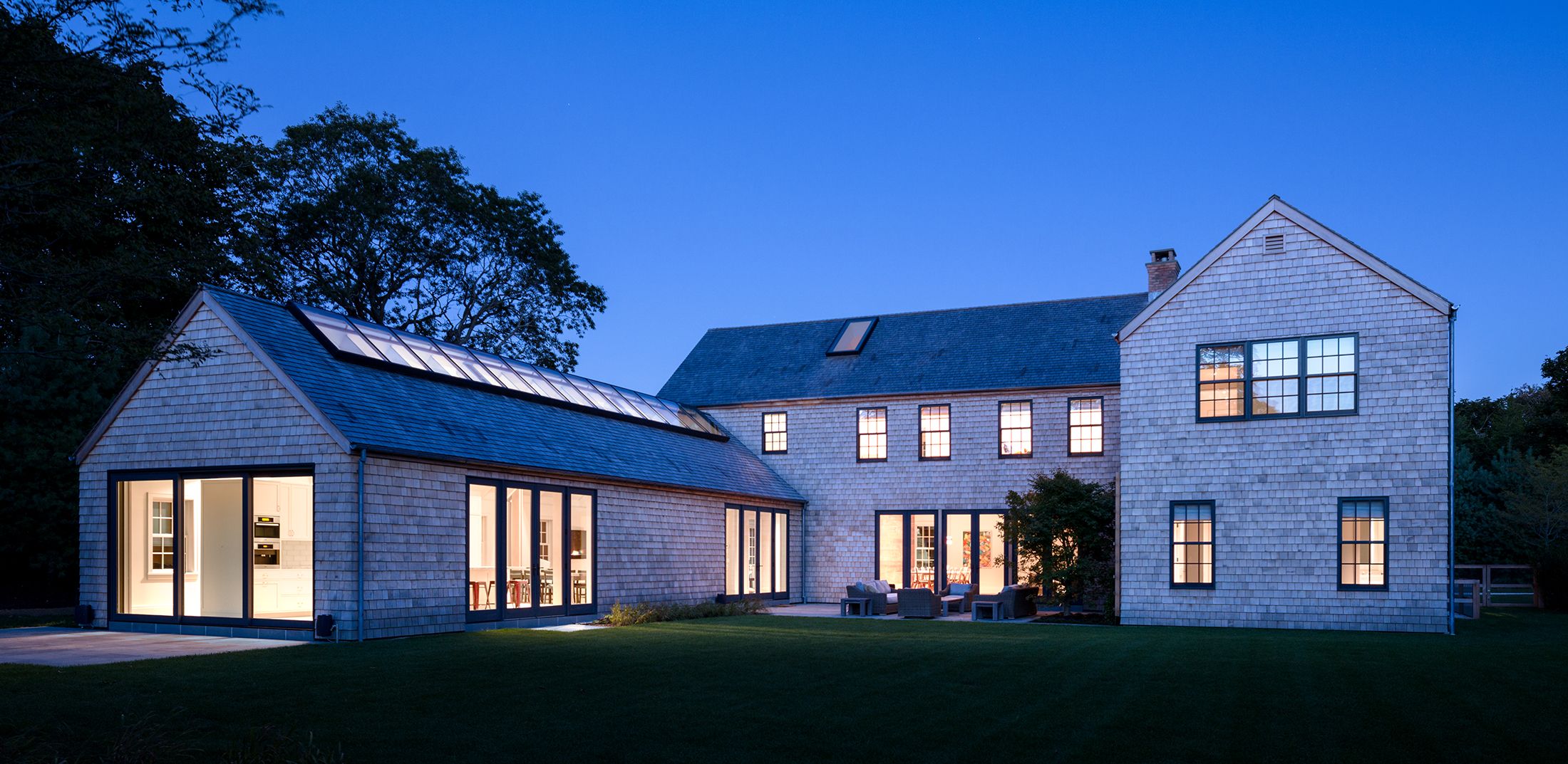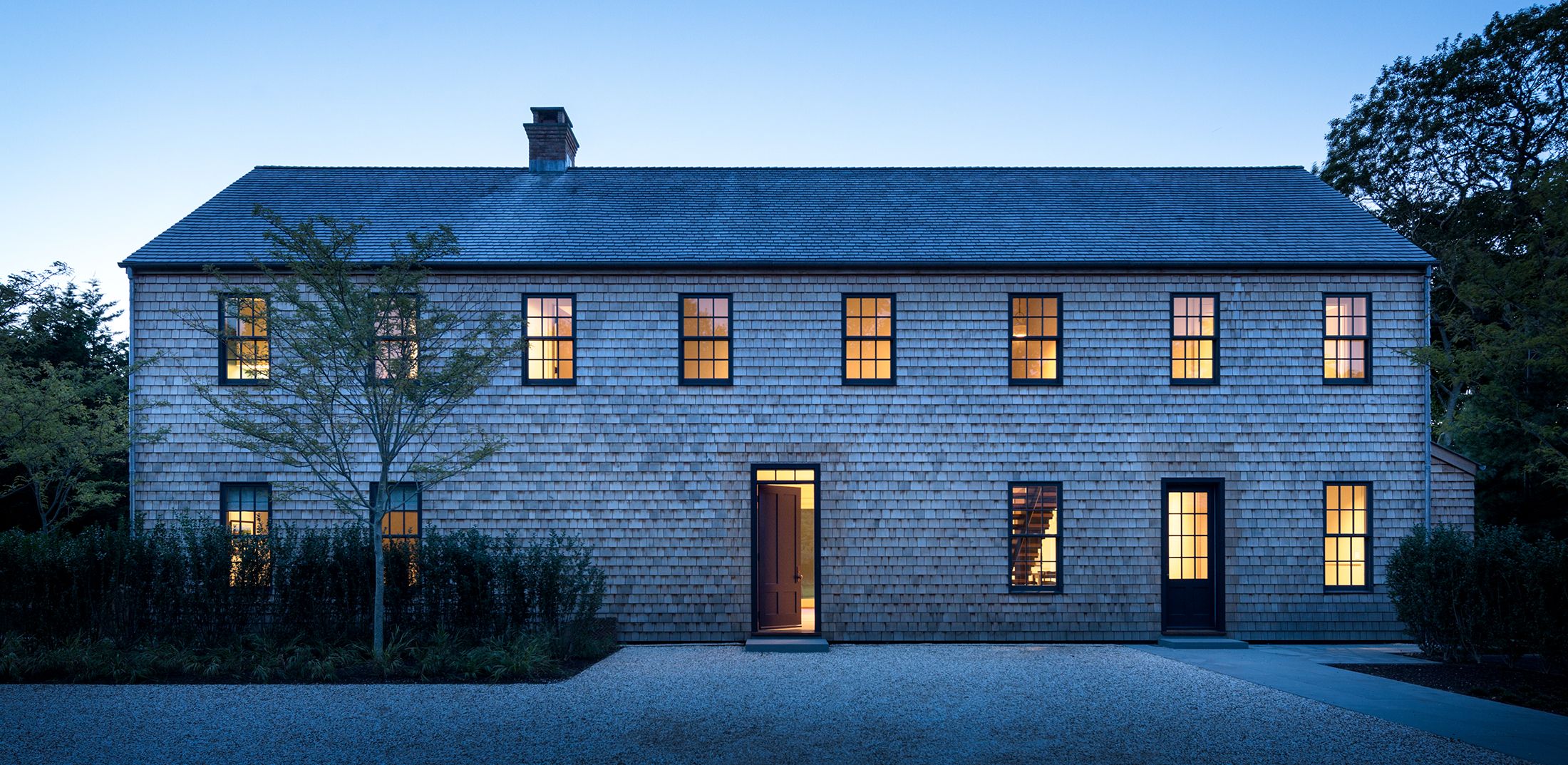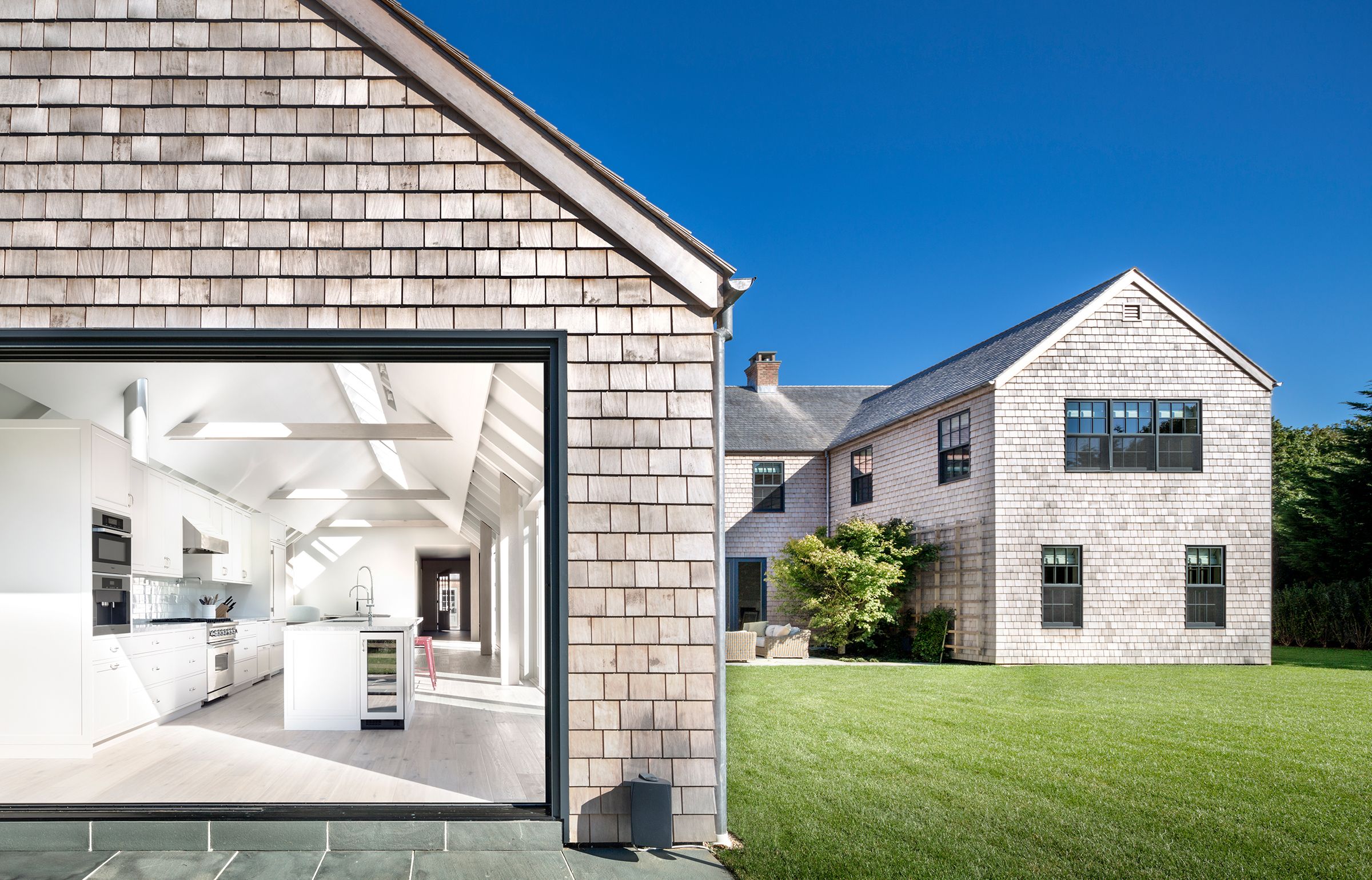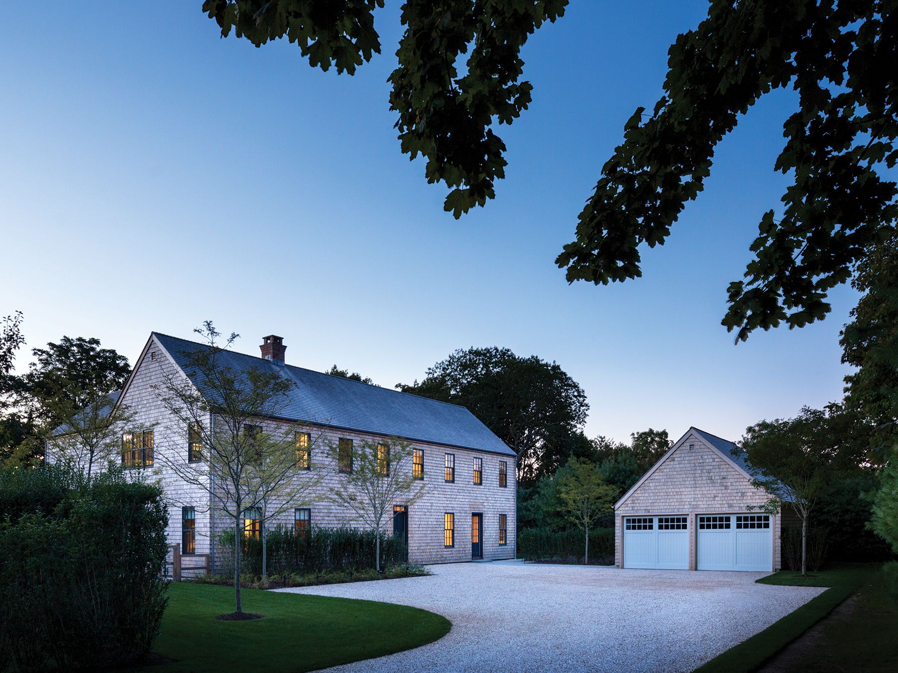This 9,900-square-foot new-build house combines a traditional façade, inspired by its setting in the quaint village of East Hampton, with contemporary, light-filled interiors designed for 21st-century living. Formal, historic and private, the street-facing elevation evidences the elegant proportions and spare detail of Shaker architecture, while the rear proves more informal, modern and open, its wide sliding-glass doors leading to a sun-filled backyard. Inside, natural materials and large windows visually connect this family country home to the landscape. The ground-floor great room’s exposed wood rafters, open plan and natural light — much of it from a 45-foot-long gabled skylight — continue the relaxed feeling. Upstairs, four bedrooms sit off a single hallway running the length of the house, allowing for easy transfer of light and air.
