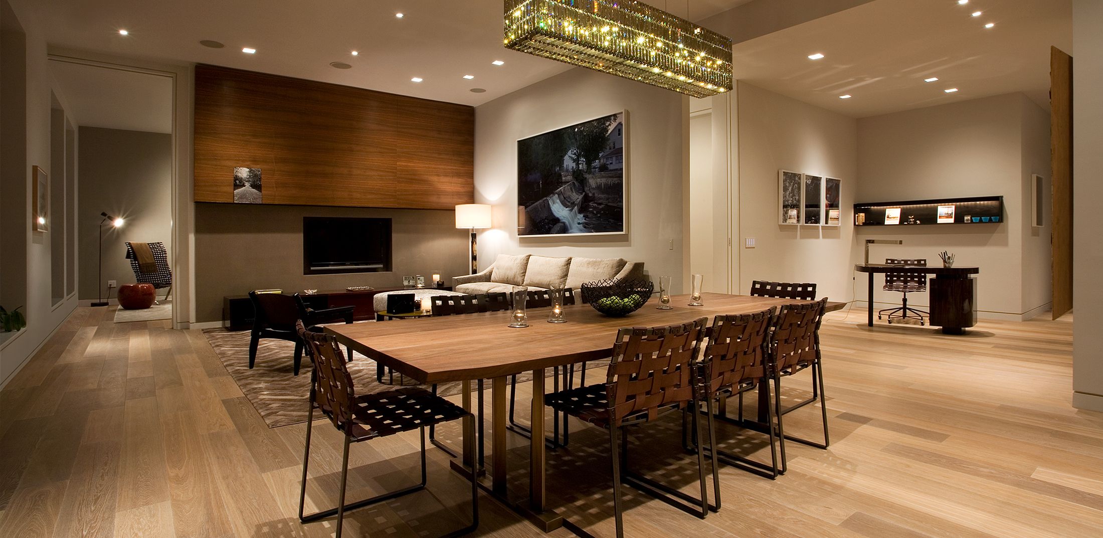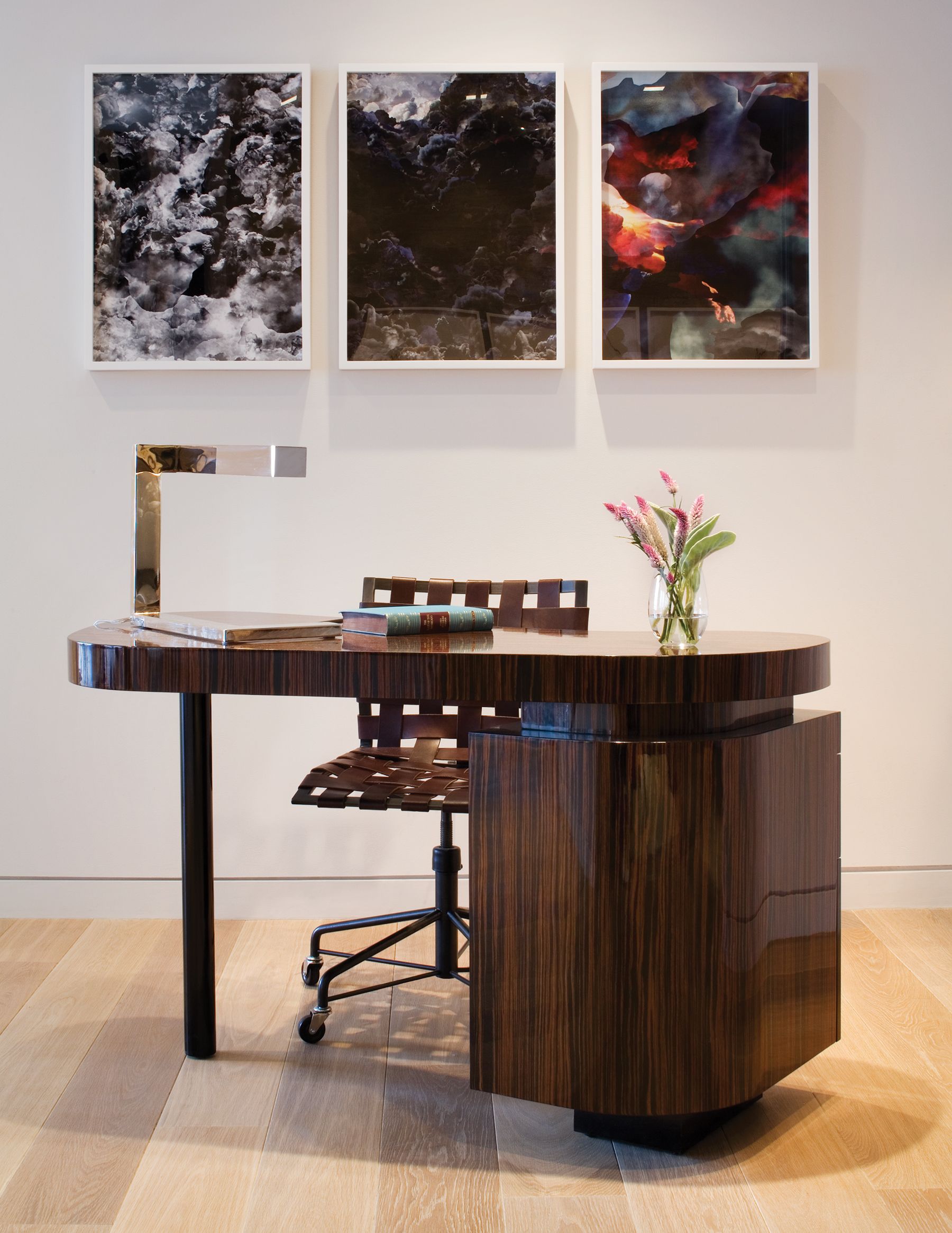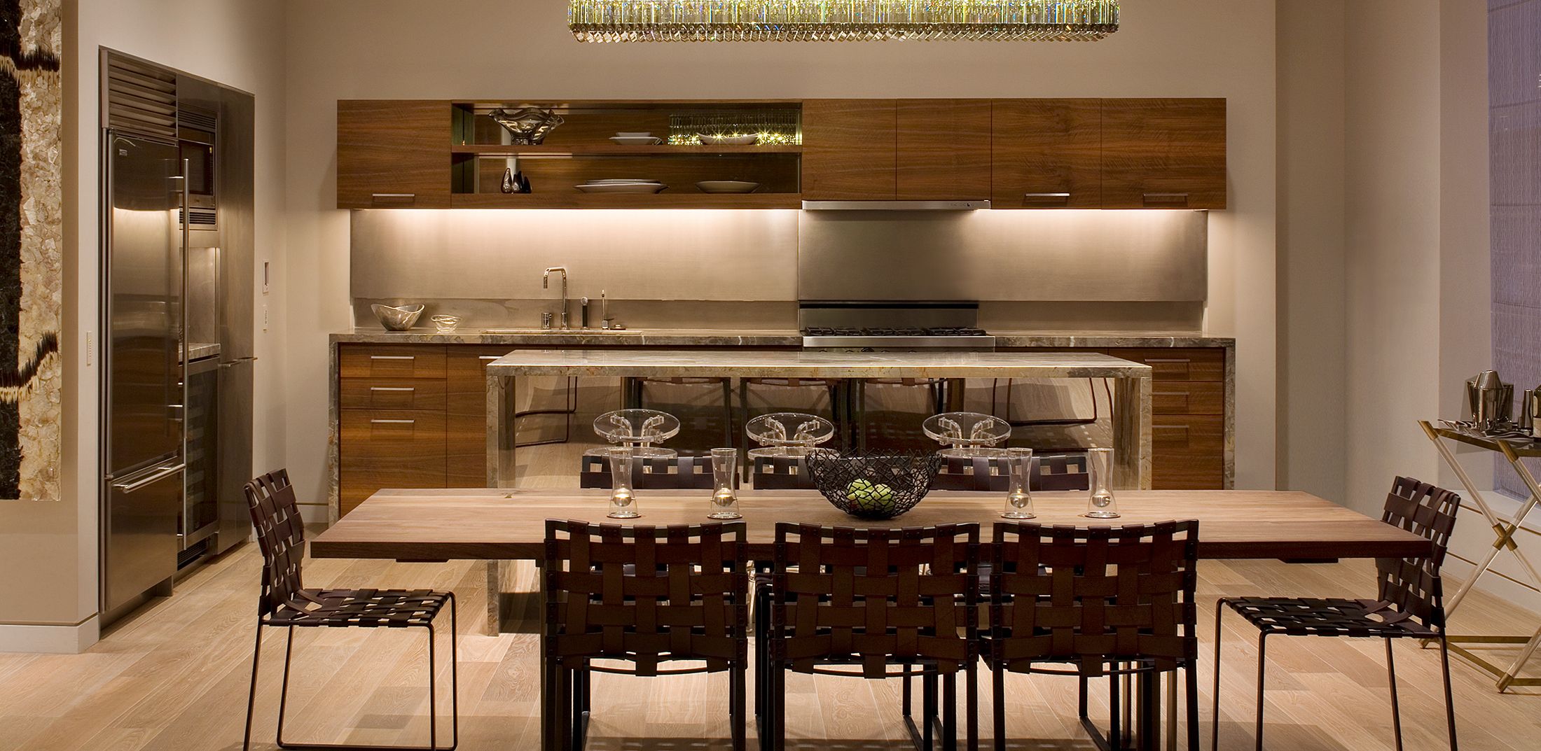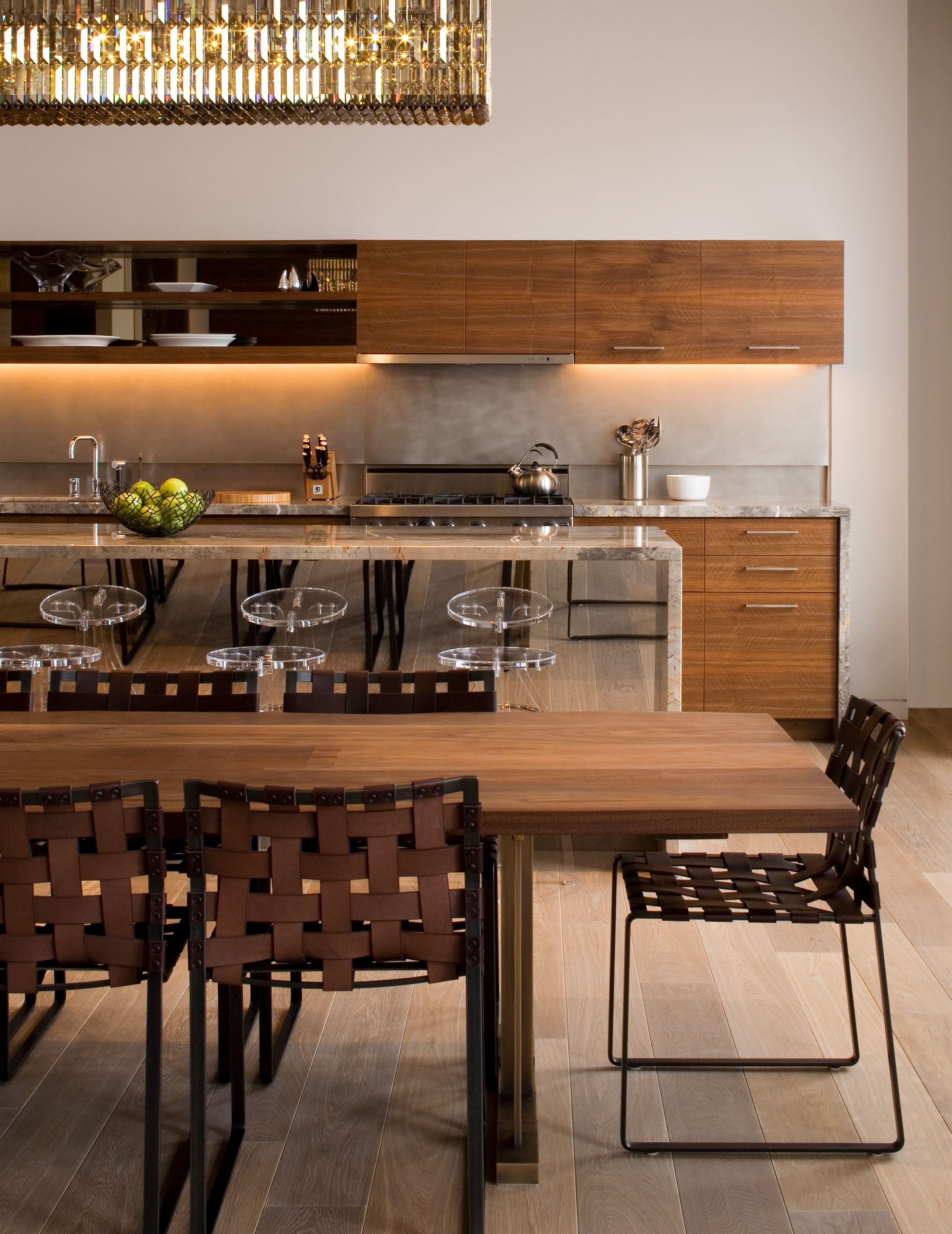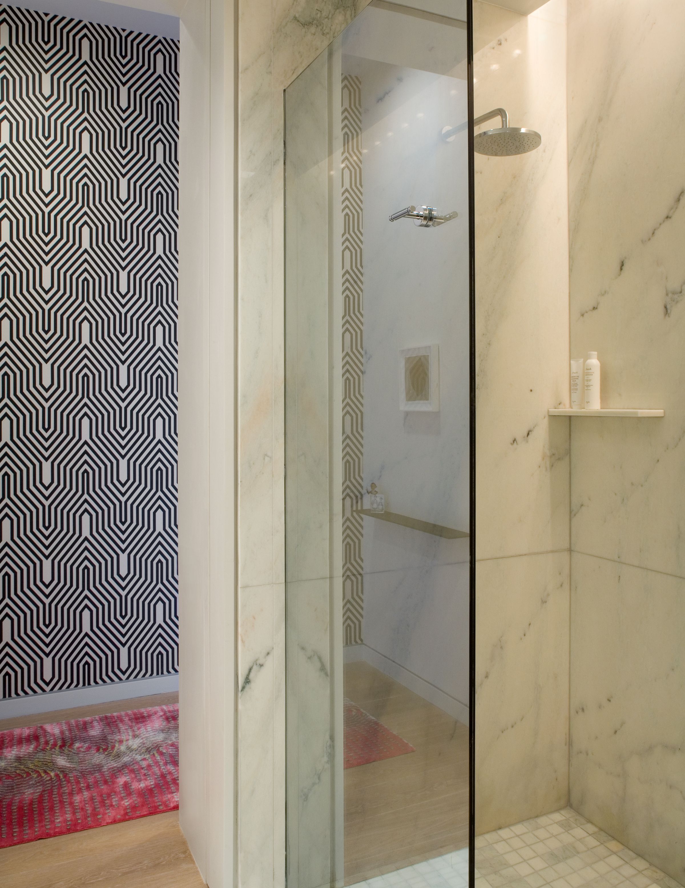 A study in materiality, with texture and pattern explored in virtually every surface, this project in Manhattan’s Greenwich Village transformed a raw commercial space into a 1,750-square-foot loft comprising a master suite, a convertible media-guest room and a great room with an open kitchen designed for entertaining. Clad largely in stainless steel and European walnut, the kitchen centers on a French-marble-topped island whose angled, mirror-polished sides reflect a fumed-oak floor and clear acrylic stools. The eclectic living area features a herringbone-patterned, warmly colored silk rug and custom crushed-velvet sofa and lacquered credenza. In the master, an eel-skin leather headboard sits atop a celadon silk carpet, while the media-guestroom includes a mid-20th-century Italian glass pendant light and raked-plaster walls. Calacatta marble slabs and floating glass walls define the bathrooms.