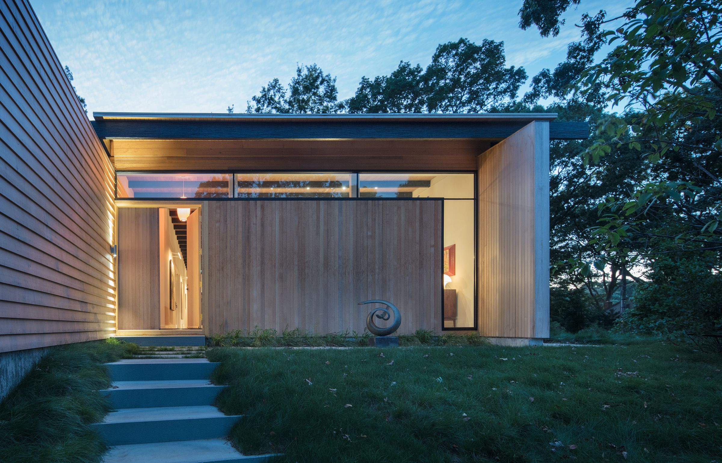 This 3,000 sf private residence sits just outside of the village of Sag Harbor, NY. The house is situated on the highest point of the property to take advantage of the water views. It is comprised of three volumes, the Great Room, featuring kitchen, dining, and living areas, the Master Suite, and the Guest Wing. A lap pool and an adjacent courtyard provide space for outdoor entertaining.