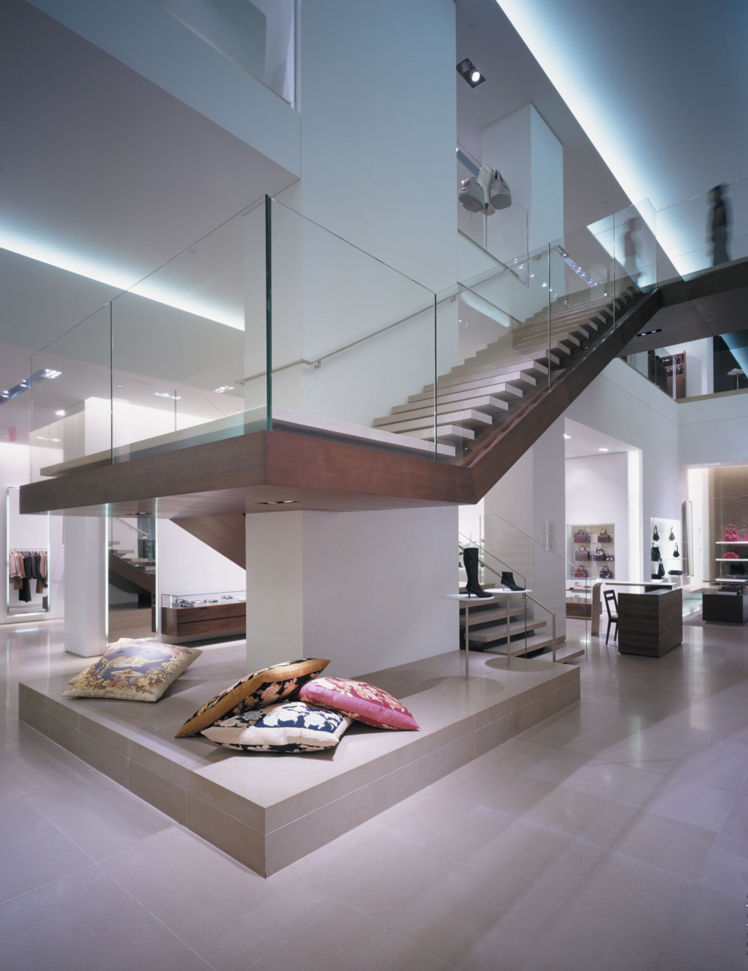 One element of a multi-year collaboration with the Italian fashion house that resulted in new locations across the U.S. — including at Long Island’s Americana Manhasset — the design of this 20,000-square-foot, bi-level flagship on Manhattan’s Fifth Avenue inaugurated a new generation of stateside Salvatore Ferragamo stores. The flagship seamlessly melds two existing retail spaces across a pair of prominent buildings, creating a singularly grand Ferragamo environment. Containing men’s and women’s collections, state-of-the-art fitting rooms, a custom-footwear atelier and a gallery, the space draws customers in with enticing views down its bays and such dramatic features as a wood, stone and glass staircase that wraps a monolithic stone column. This terminates in a bridge connecting the store’s east and west sides, leading to the men’s footwear salon in a glass-enclosed aerie overlooking Fifth Avenue.